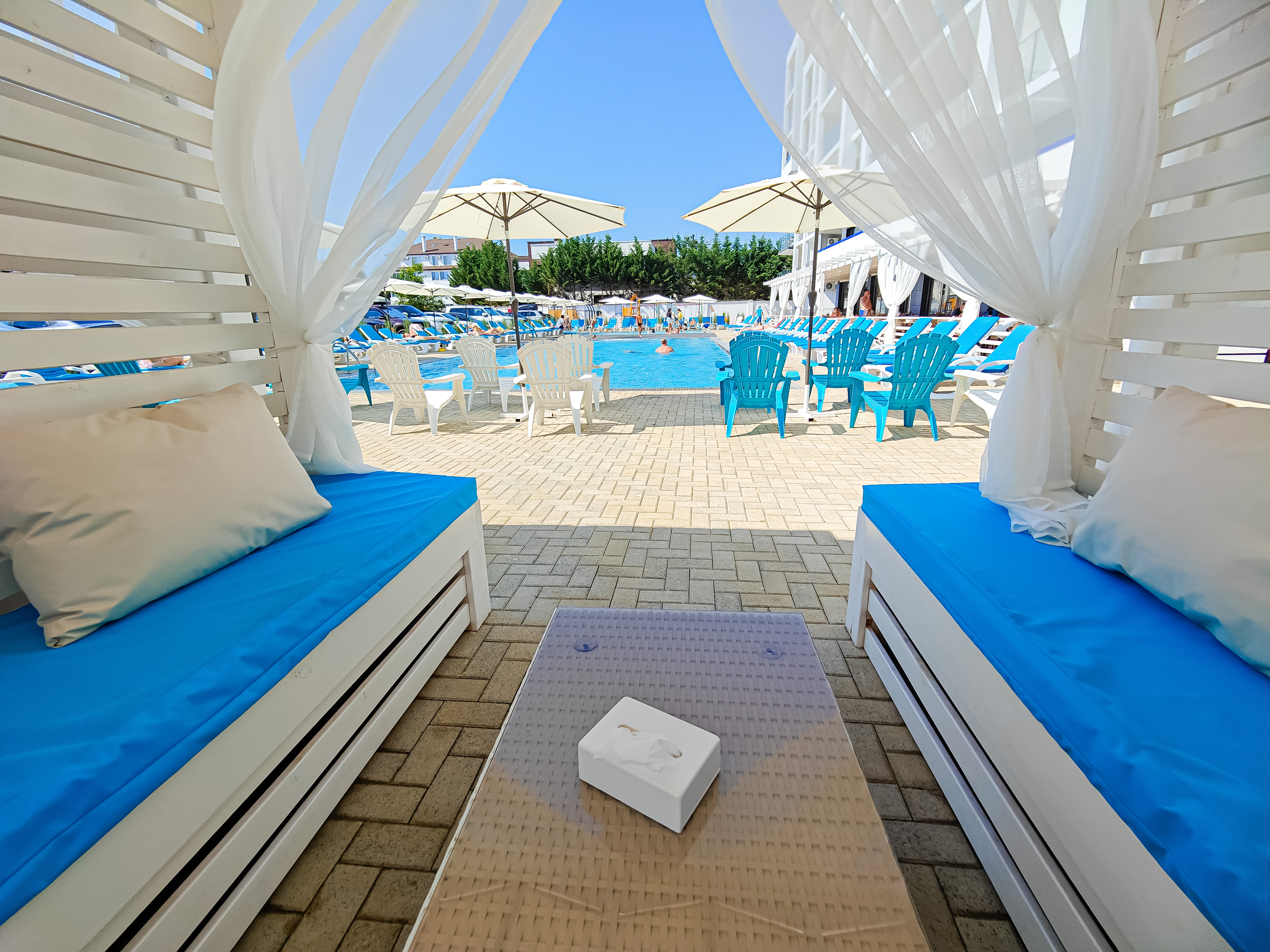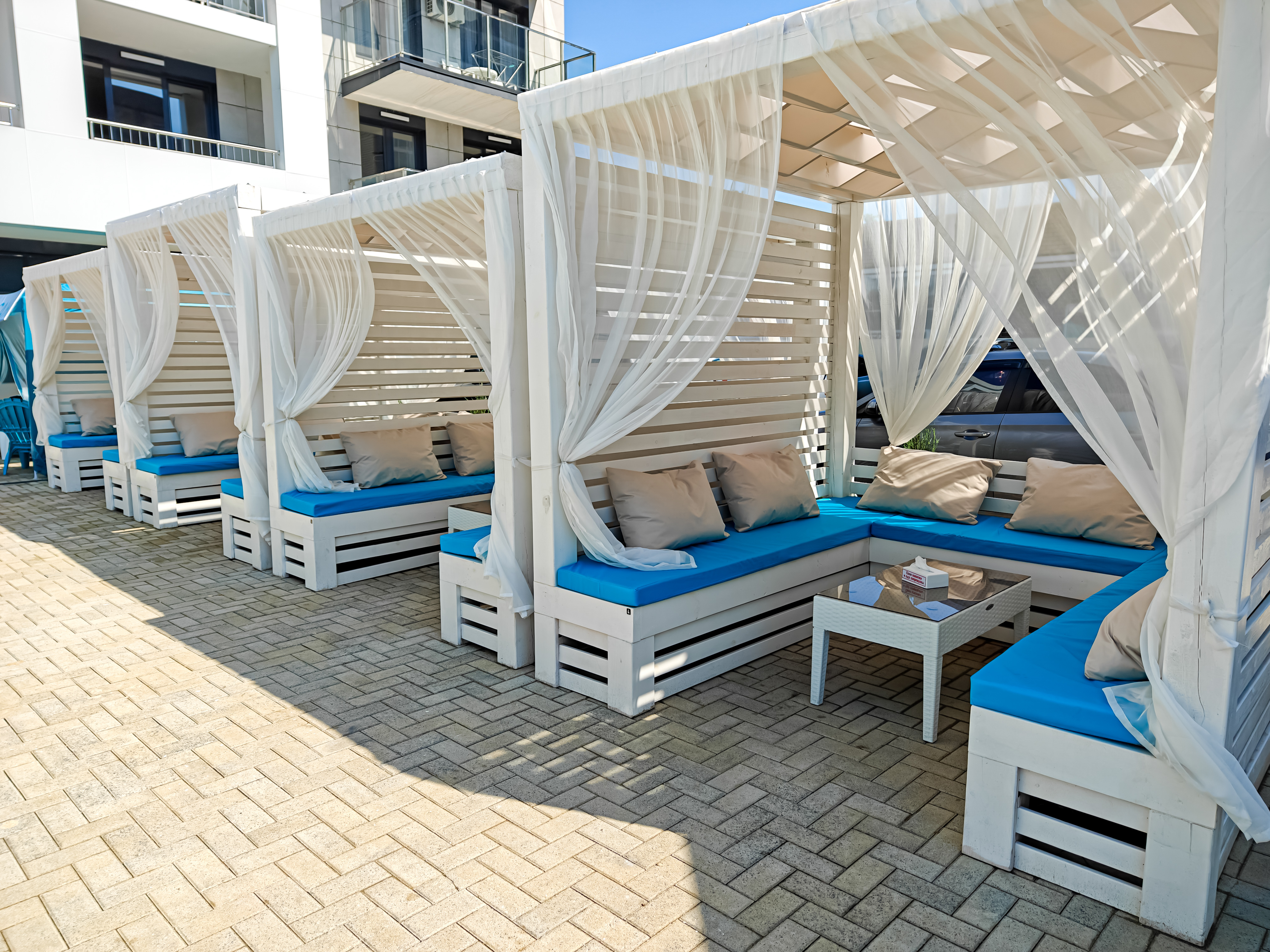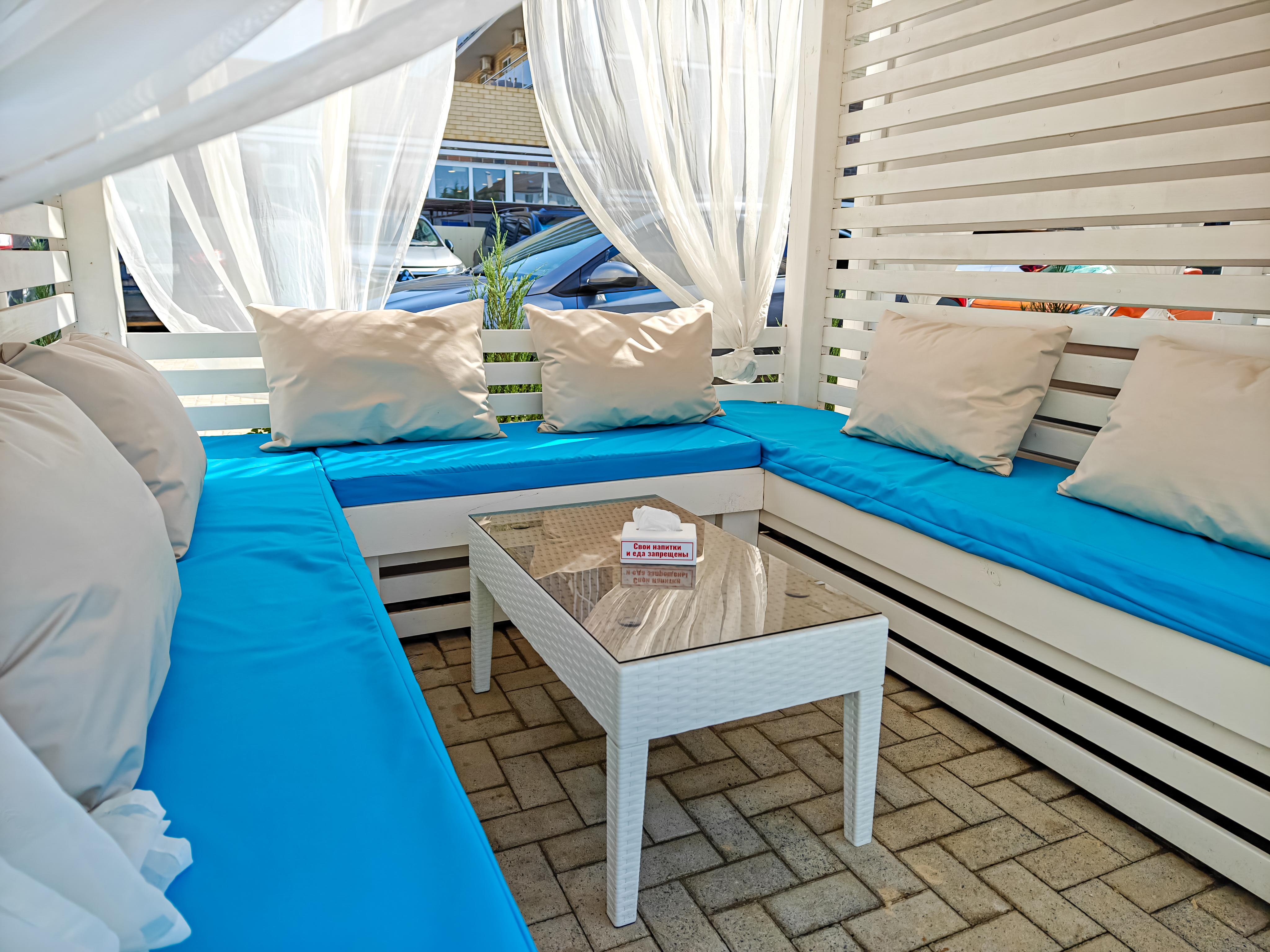 Возле бара находится Лаунж-зона (беседки открытого типа), в них можно комфортно расположиться на диванчиках с подушками, заказать еду из кафе или напитки из бара «7 Небо» и просто насладиться отдыхом.